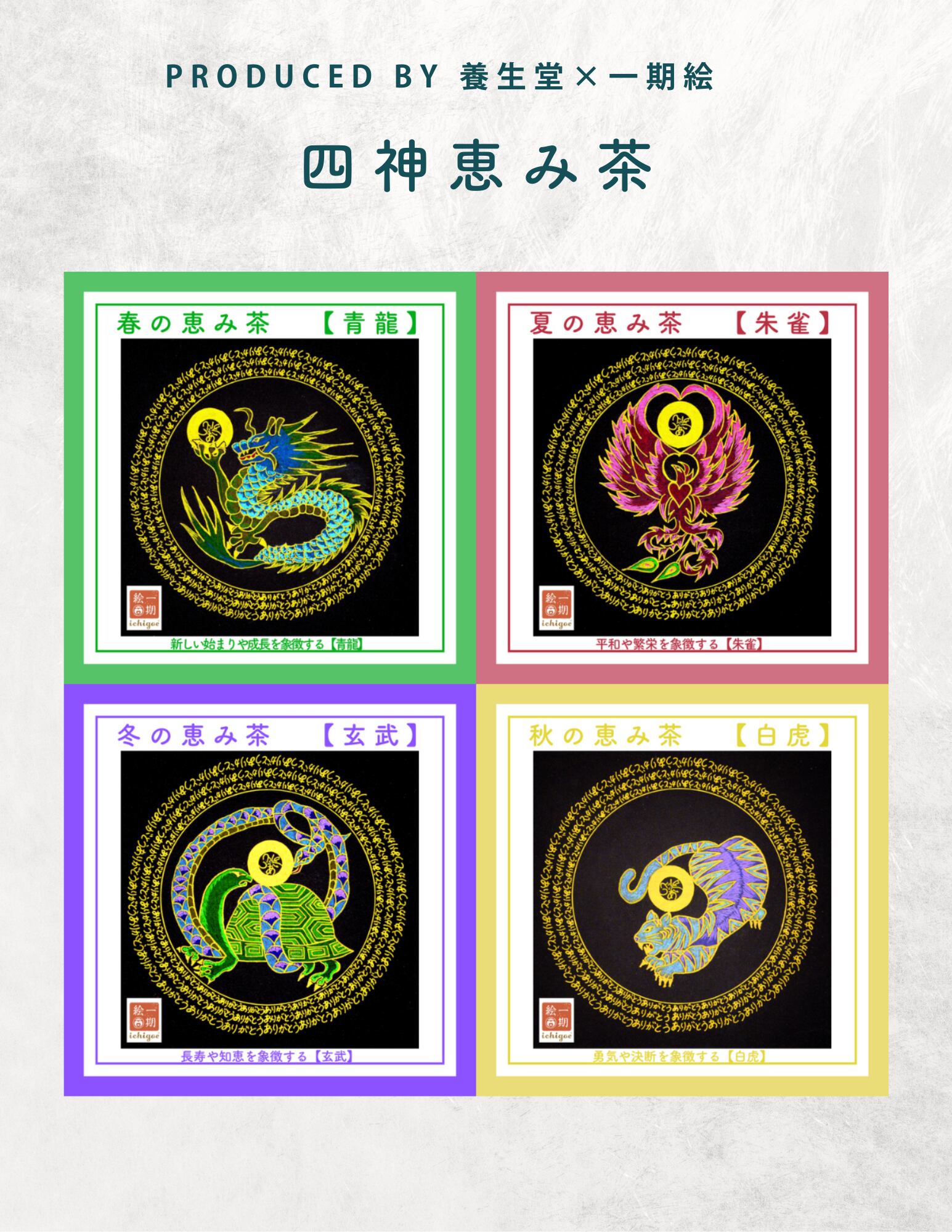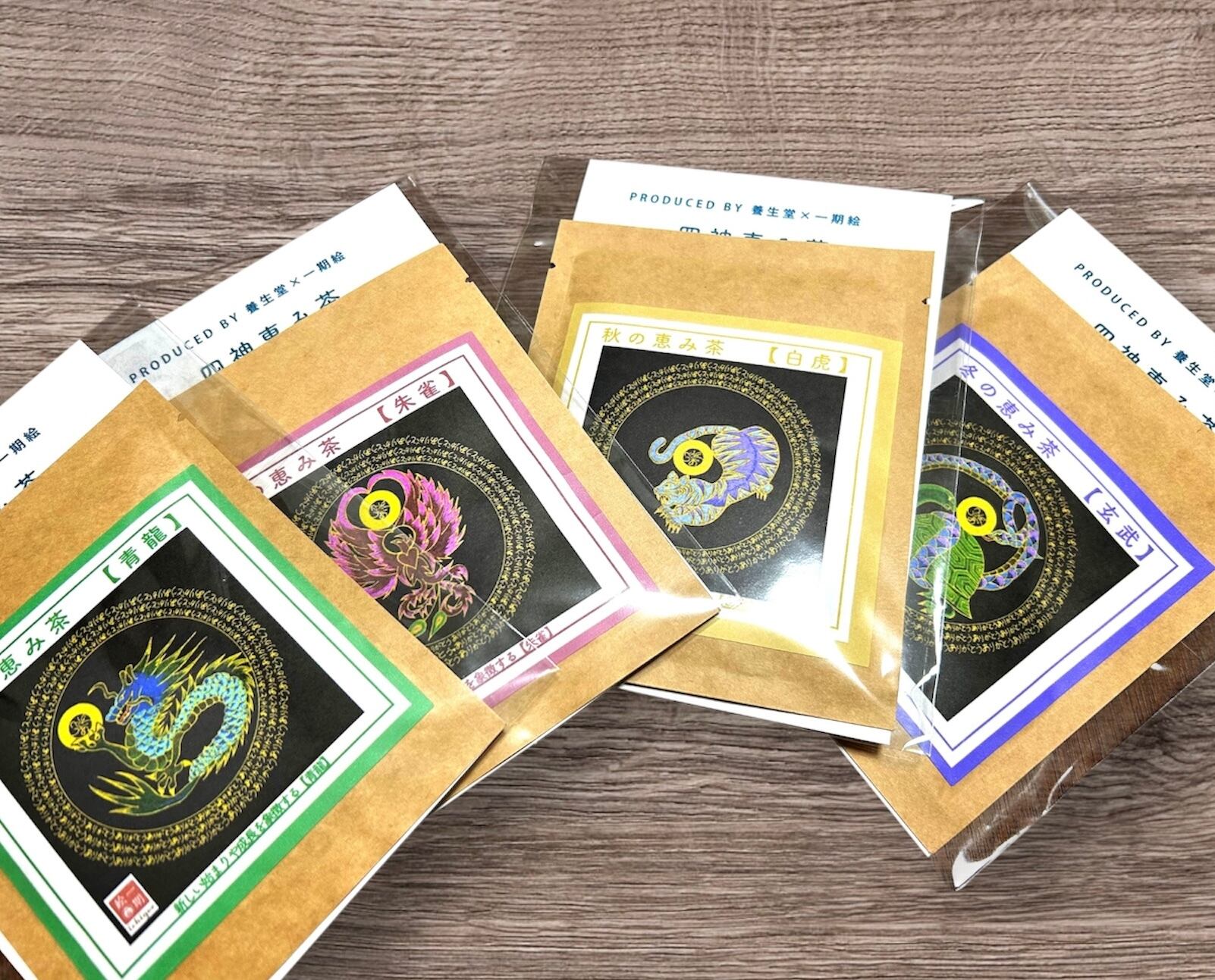 この商品は養生堂と一期絵のコラボ商品です。四神【青龍】【朱雀】【白虎】【玄武】が1包ずつ入った特別なセットです四神それぞれの特長を活かしたお茶が1包ずつ収められており、心身のバランスを整える充実の内容でお届けします!美しい四神ありがとう曼荼羅の絵がパッケージに施され、感謝の気持ちを感じながらお楽しみいただけます。 この四神恵み茶セットには、青龍から朱雀、白虎、玄武まで、それぞれの神秘的なエッセンスに由来する独自のブレンドがお楽しみいただけます。青龍のお茶はリフレッシュ効果、朱雀は活力を与え、白虎は安らぎを、そして玄武は心身を温める特長があります。それぞれの茶葉が持つ自然の恵みを通じて、心地良いひとときを体験していただけます。 このセットは、友人や家族とともに分かち合うひとときや、特別なオフの時間にふさわしいアイテムです。また、感謝の気持ちを伝える贈り物としても喜ばれるでしょう。四神の恵みとともに、あなたの生活に豊かな風味をプラスしてみませんか?この四神恵み茶セットをぜひあなたのお手元にお迎えください。